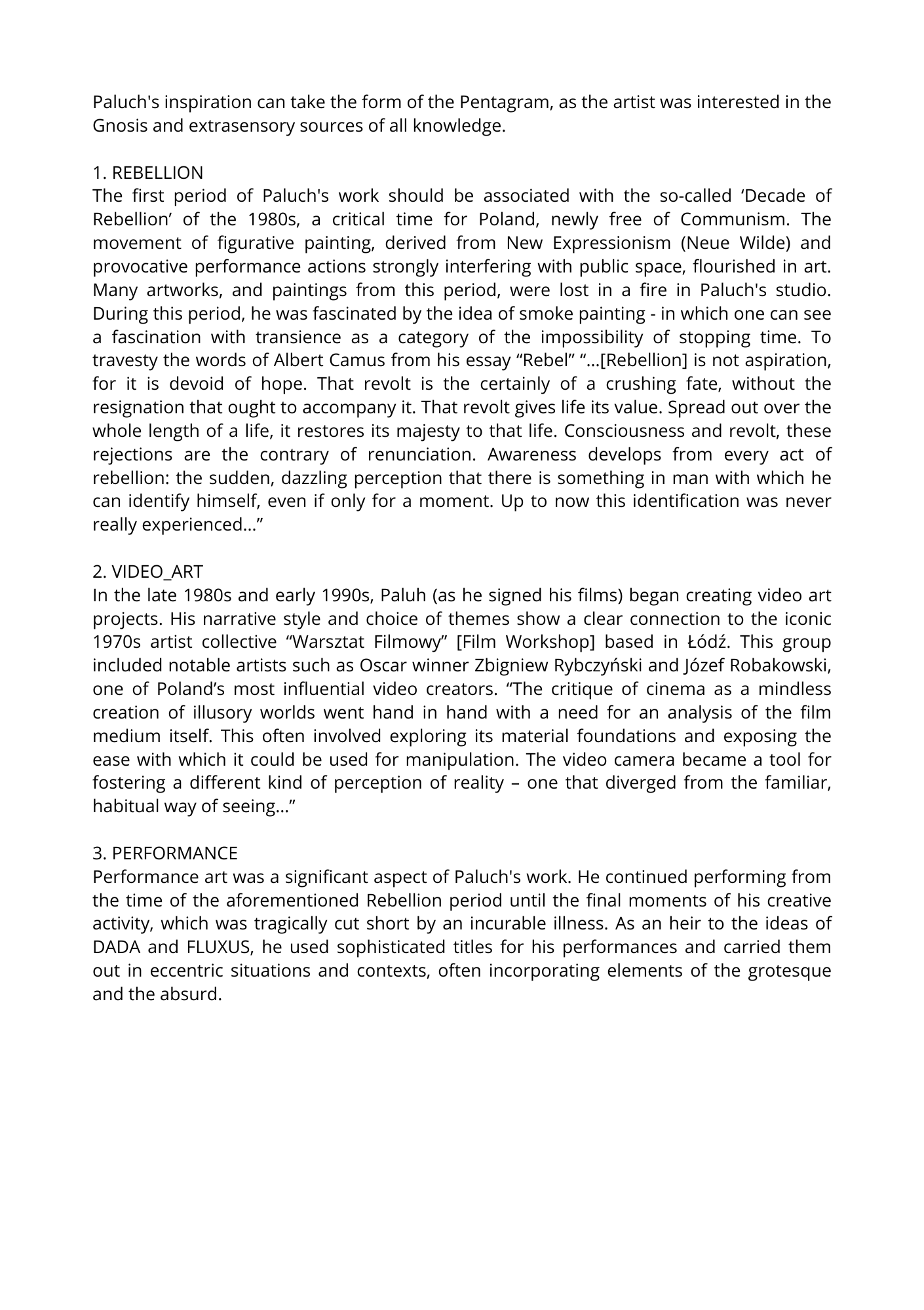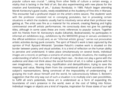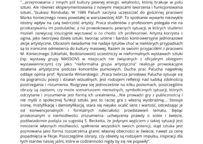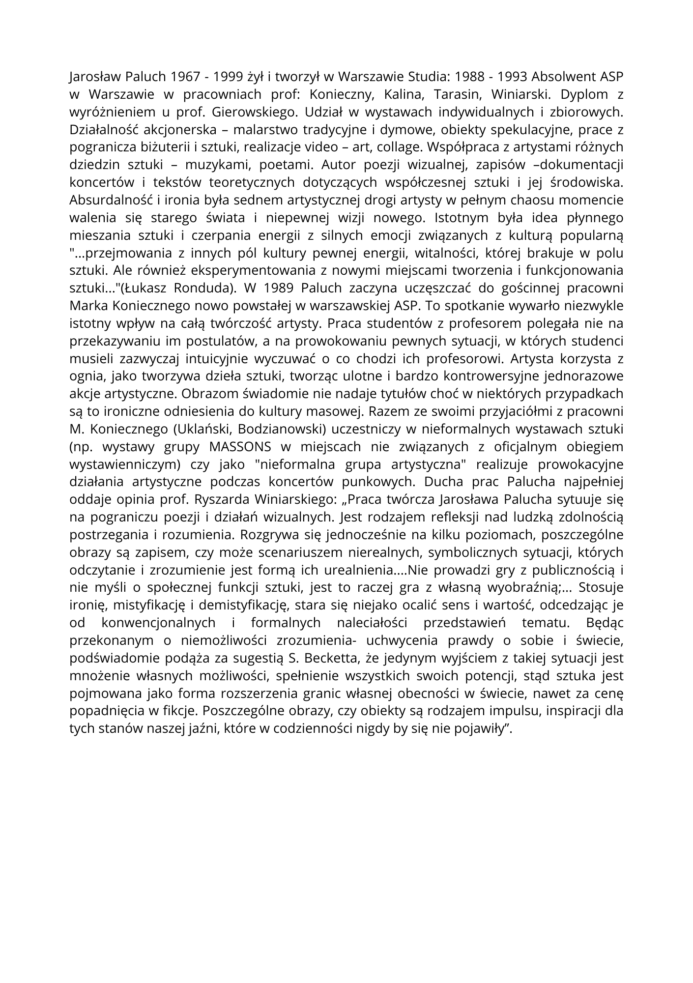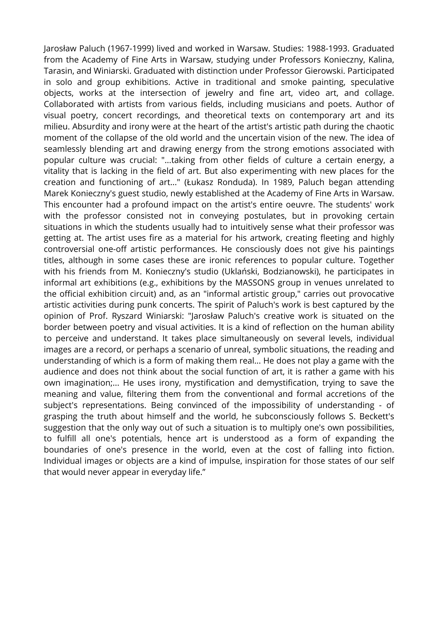 Jarosław Paluch [1967-1999] – artysta, malarz, performer, realizator videoart, poeta, buntownik. Tworzył i żył w Warszawie, pod wpływem pracowni gościnnej realizował swoje wystąpienia performance w duchu Fluxus i Neo-dada. Ukończył z wyróżnieniem dyplom warszawskiej ASP w pracowni Stefana Gierowskiego, z której wyniósł idee czystej abstrakcji w malarstwie.