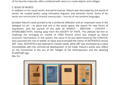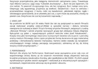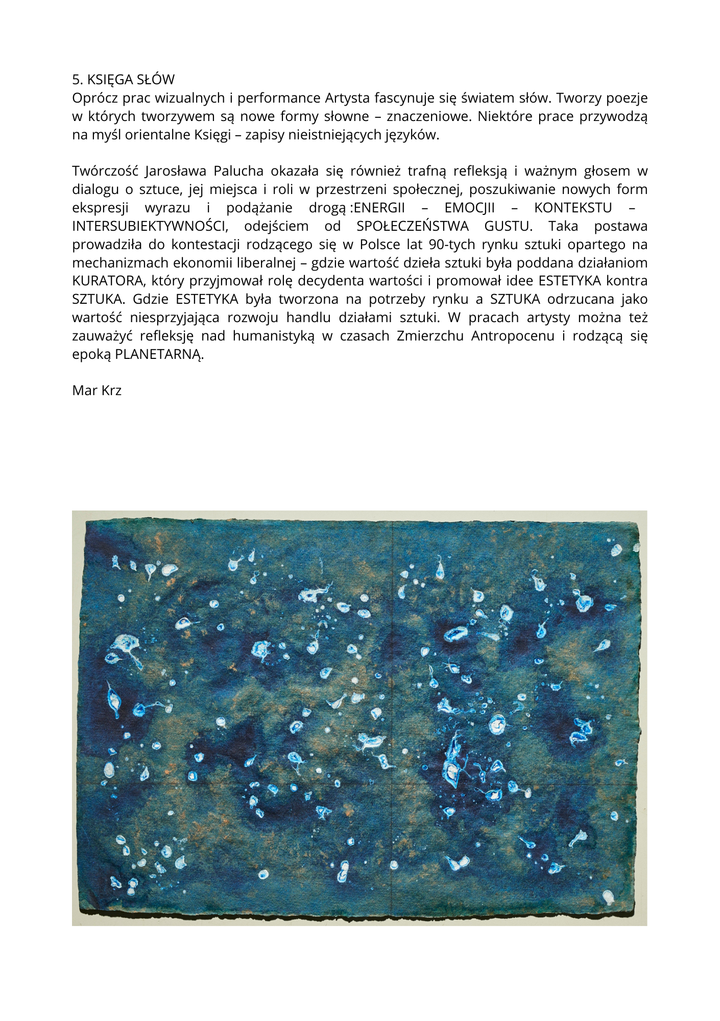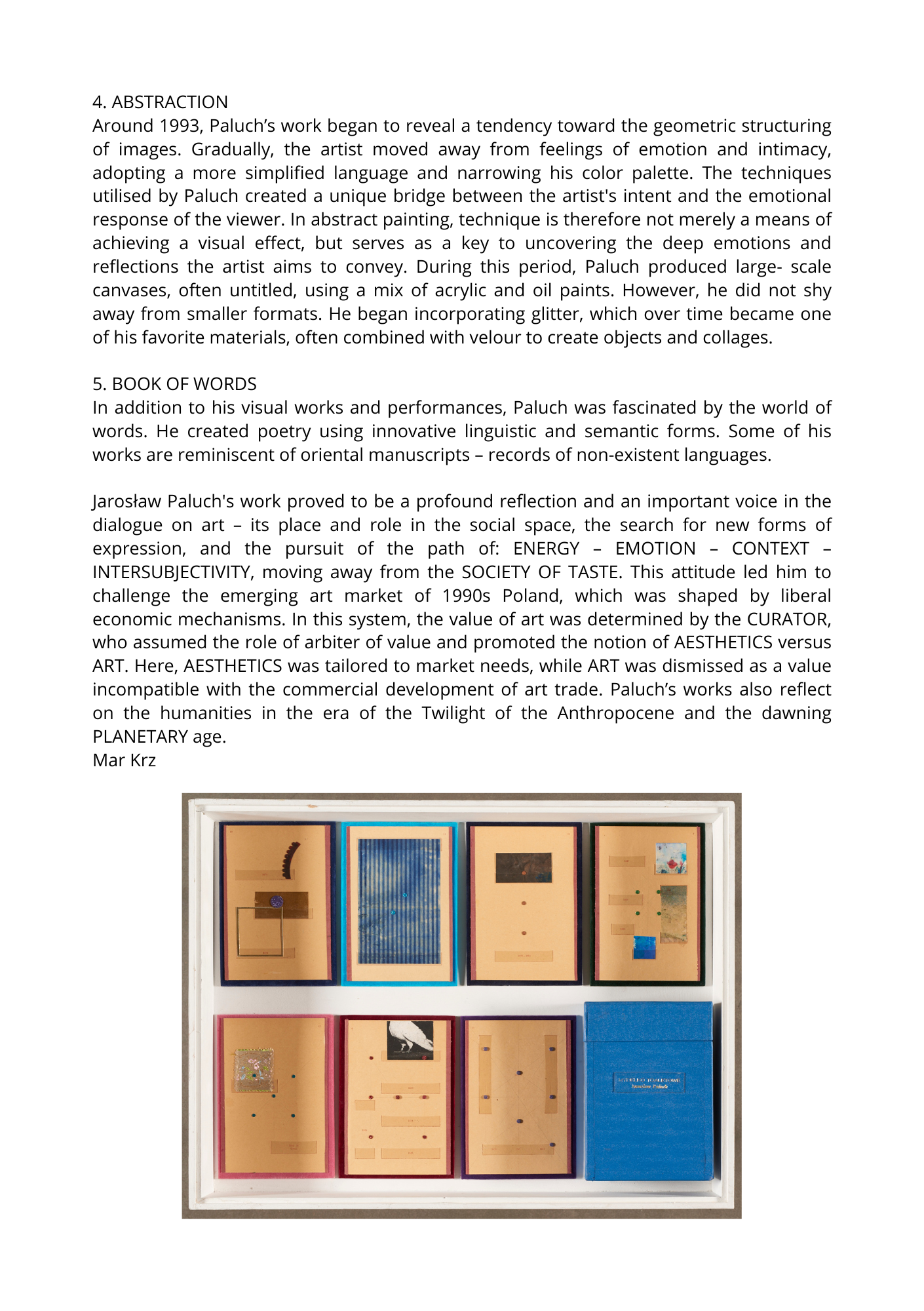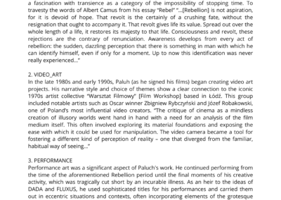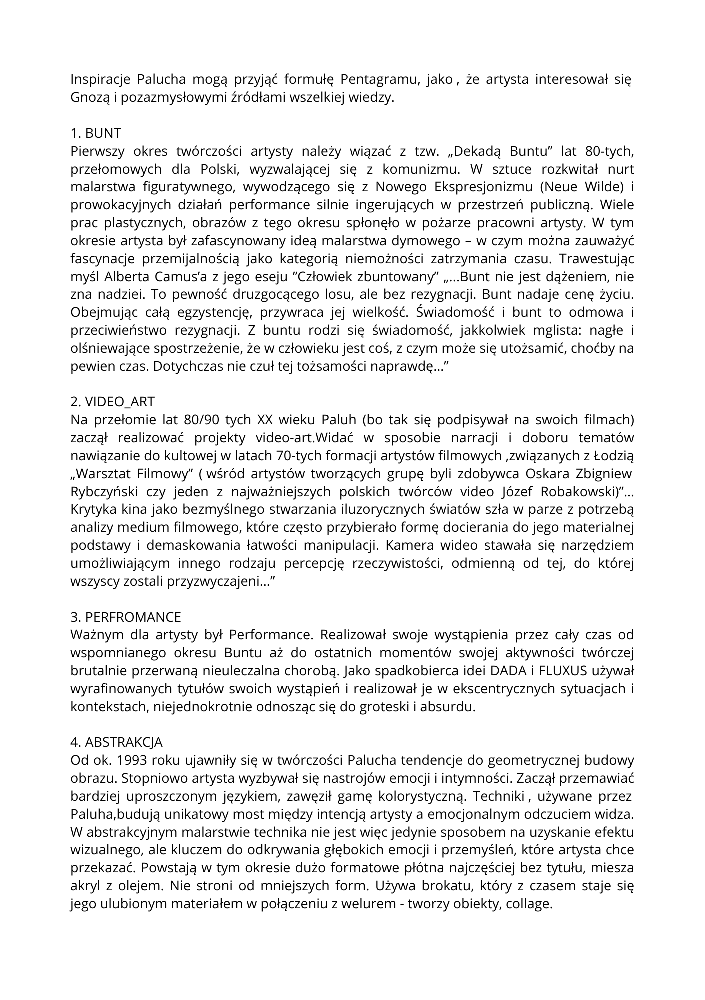 Jarosław Paluch [1967-1999] – artysta, malarz, performer, realizator videoart, poeta, buntownik. Tworzył i żył w Warszawie, pod wpływem pracowni gościnnej realizował swoje wystąpienia performance w duchu Fluxus i Neo-dada. Ukończył z wyróżnieniem dyplom warszawskiej ASP w pracowni Stefana Gierowskiego, z której wyniósł idee czystej abstrakcji w malarstwie.